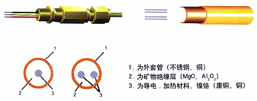 礦物J緣加熱電纜是采用 單根或多根合金電熱絲作為發(fā)熱源、高純度、高溫、電熔結(jié)晶氧化鎂作導(dǎo)熱J緣體,無(wú)縫連續(xù)不銹鋼或銅管作為護(hù)套,采用特殊生產(chǎn)工藝制造而成。有強(qiáng)腐蝕作用的場(chǎng)所可外加PE或低煙無(wú)鹵的外套。
